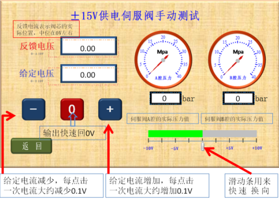 6、比例閥正常時的表現(xiàn)為:a、給定電流12.00ma時,反饋電流在12.00ma,比例閥輸出的A、B腔壓力相同;b、用滑動條可迅速換向,反饋電流改變且A、B腔壓力差較大;c、點擊增加按鈕,反饋電流逐漸增加且A、B腔壓力差逐漸增大;d、點擊減少按鈕,反饋電流逐漸減少且A、B腔壓力差逐漸減少,過12.00ma后比例閥會換向;