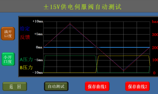 8、選擇滿開口度后點擊“自動測試”可使伺服閥從0開口度逐漸增加到+100%開口度,再逐漸減少到-100%,然后逐漸增加到0開口度;選擇小開口度后點擊“自動測試”可使伺服閥從0開口度逐漸增加到+20%開口度,再逐漸減少到-20%,然后逐漸增加到0開口度;